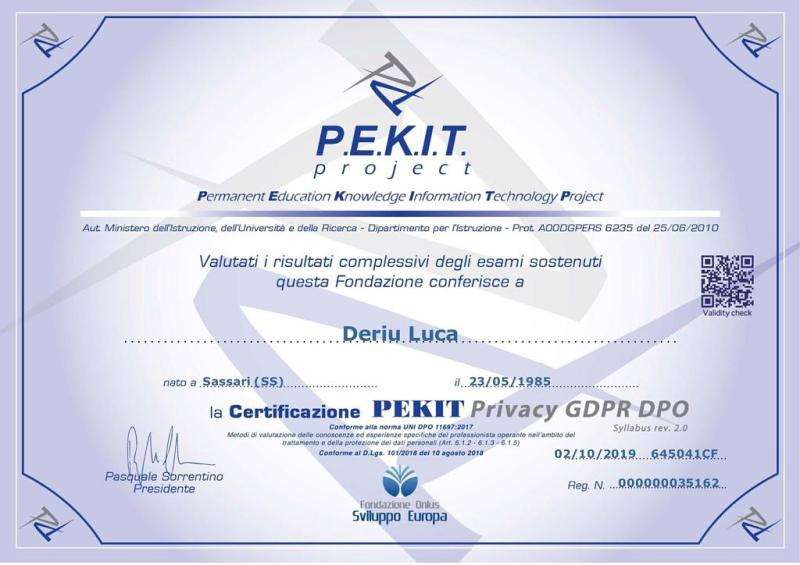 Certificazione PEKIT Privacy & GDPR – DPO – Gestione sicurezza dati e compliance normativa Europea.