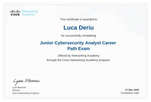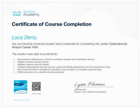 Junior Cybersecurity Analyst Path (Cisco) – Gestione rischi, protezione reti e incident response.
