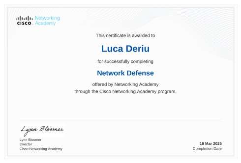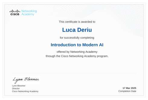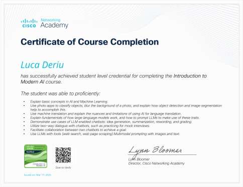 Cisco Academy Specializations: Endpoint Security, Network Defense, Introduction to Modern AI.