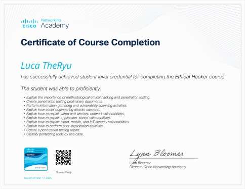 Ethical Hacker (Cisco Academy) – Metodologie di hacking etico e penetration testing.