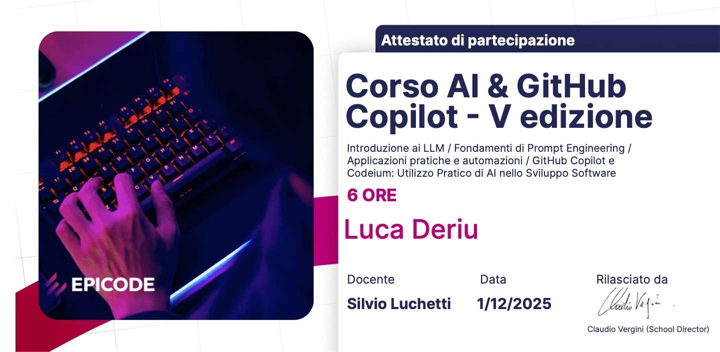 ![Corso AI & GitHub Copilot deriu luca consulente informatico sardegna {"type":"elementor","siteurl":"https://www.theryu.eu/wp-json/","elements":[{"id":"2824a8f","elType":"widget","isInner":false,"isLocked":false,"settings":{"scroller":[{"id":15781,"url":"https://www.theryu.eu/wp-content/uploads/2025/11/1596562679104-2.jpeg"},{"id":15789,"url":"https://www.theryu.eu/wp-content/uploads/2025/11/1742834756047.jpeg"},{"id":15782,"url":"https://www.theryu.eu/wp-content/uploads/2025/11/1741032976953.jpeg"},{"id":15776,"url":"https://www.theryu.eu/wp-content/uploads/2025/11/1745962905660.jpeg"},{"id":15777,"url":"https://www.theryu.eu/wp-content/uploads/2025/11/1742231522243.jpeg"},{"id":15778,"url":"https://www.theryu.eu/wp-content/uploads/2025/11/1742231169298.jpeg"},{"id":15779,"url":"https://www.theryu.eu/wp-content/uploads/2025/11/1742230818229.jpeg"},{"id":15780,"url":"https://www.theryu.eu/wp-content/uploads/2025/11/1731454805790.png"},{"id":15784,"url":"https://www.theryu.eu/wp-content/uploads/2025/11/1741171613280.jpeg"},{"id":15785,"url":"https://www.theryu.eu/wp-content/uploads/2025/11/1742413949932.jpeg"},{"id":15786,"url":"https://www.theryu.eu/wp-content/uploads/2025/11/1742230159354.jpeg"},{"id":15787,"url":"https://www.theryu.eu/wp-content/uploads/2025/11/1742230657719.jpeg"},{"id":15788,"url":"https://www.theryu.eu/wp-content/uploads/2025/11/1742219839431.jpeg"},{"id":15790,"url":"https://www.theryu.eu/wp-content/uploads/2025/11/1742221301648.jpeg"},{"id":15791,"url":"https://www.theryu.eu/wp-content/uploads/2025/11/1745961204340.jpeg"}],"dk_ls_images_view":"fit","arrows":"","arrows_tablet":"","arrows_mobile":"","fullscreen":"","autoplay":"yes","autoplay_speed":1,"autoplay_on_hover":"","l_arrow_h_position":"center","dk_ls_images_view_tablet":"","dk_ls_images_view_mobile":"","ls_max_width":{"unit":"px","size":"","sizes":[]},"ls_max_width_tablet":{"unit":"px","size":"","sizes":[]},"ls_max_width_mobile":{"unit":"px","size":"","sizes":[]},"ls_min_width":{"unit":"px","size":"","sizes":[]},"ls_min_width_tablet":{"unit":"px","size":"","sizes":[]},"ls_min_width_mobile":{"unit":"px","size":"","sizes":[]},"dk_pt_images_view":"fit","dk_pt_images_view_tablet":"fit","dk_pt_images_view_mobile":"fit","pt_max_width":{"unit":"px","size":"","sizes":[]},"pt_max_width_tablet":{"unit":"px","size":"","sizes":[]},"pt_max_width_mobile":{"unit":"px","size":"","sizes":[]},"pt_min_width":{"unit":"px","size":"","sizes":[]},"pt_min_width_tablet":{"unit":"px","size":"","sizes":[]},"pt_min_width_mobile":{"unit":"px","size":"","sizes":[]},"view":"traditional","_element_height":"initial","_element_height_tablet":"initial","_element_height_mobile":"initial","photo_scroller_height":{"unit":"px","size":"","sizes":[]},"photo_scroller_height_tablet":{"unit":"px","size":"","sizes":[]},"photo_scroller_height_mobile":{"unit":"px","size":"","sizes":[]},"thumbnails":"yes","thumb_position":"inside-hidden","overlay_title":"","overlay_description":"","inactive_content":"yes","scroller_padding":{"unit":"px","top":"","right":"","bottom":"","left":"","isLinked":true},"scroller_padding_tablet":{"unit":"px","top":"","right":"","bottom":"","left":"","isLinked":true},"scroller_padding_mobile":{"unit":"px","top":"","right":"","bottom":"","left":"","isLinked":true},"overlay":"no","image_opacity":{"unit":"%","size":"","sizes":[]},"thumb_width":{"unit":"px","size":"","sizes":[]},"thumb_height":{"unit":"px","size":"","sizes":[]},"thumb_space":{"unit":"px","size":"","sizes":[]},"padding_thumb_bg":{"unit":"px","top":"","right":"","bottom":"","left":"","isLinked":true},"padding_thumb_bg_tablet":{"unit":"px","top":"","right":"","bottom":"","left":"","isLinked":true},"padding_thumb_bg_mobile":{"unit":"px","top":"","right":"","bottom":"","left":"","isLinked":true},"thumb_bg_color":"","controls_align":"center","controls_align_tablet":"","controls_align_mobile":"","icon_size":{"unit":"px","size":"","sizes":[]},"icon_size_tablet":{"unit":"px","size":"","sizes":[]},"icon_size_mobile":{"unit":"px","size":"","sizes":[]},"contr_width":{"unit":"px","size":"","sizes":[]},"contr_width_tablet":{"unit":"px","size":"","sizes":[]},"contr_width_mobile":{"unit":"px","size":"","sizes":[]},"contr_height":{"unit":"px","size":"","sizes":[]},"contr_height_tablet":{"unit":"px","size":"","sizes":[]},"contr_height_mobile":{"unit":"px","size":"","sizes":[]},"btn_space":{"unit":"px","size":"","sizes":[]},"btn_space_tablet":{"unit":"px","size":"","sizes":[]},"btn_space_mobile":{"unit":"px","size":"","sizes":[]},"btn_space_bellow":{"unit":"px","size":"","sizes":[]},"btn_space_bellow_tablet":{"unit":"px","size":"","sizes":[]},"btn_space_bellow_mobile":{"unit":"px","size":"","sizes":[]},"contr_bg_color":"","contrl_icon_color":"","next_icon":{"value":"fas fa-chevron-right","library":"fa-solid"},"prev_icon":{"value":"fas fa-chevron-left","library":"fa-solid"},"arrow_icon_size":{"unit":"px","size":"","sizes":[]},"arrow_bg_width":{"unit":"px","size":"","sizes":[]},"arrow_bg_height":{"unit":"px","size":"","sizes":[]},"arrow_border_radius":{"unit":"px","size":"","sizes":[]},"arrow_border_width":{"unit":"px","size":"","sizes":[]},"arrow_icon_color":"","arrow_border_color":"","arrow_bg_color":"","arrow_icon_color_hover":"","arrow_border_color_hover":"","arrow_bg_color_hover":"","l_arrow_v_position":"center","l_arrow_v_position_tablet":"","l_arrow_v_position_mobile":"","l_arrow_h_position_tablet":"","l_arrow_h_position_mobile":"","l_arrow_v_offset":{"unit":"px","size":"","sizes":[]},"l_arrow_v_offset_tablet":{"unit":"px","size":"","sizes":[]},"l_arrow_v_offset_mobile":{"unit":"px","size":"","sizes":[]},"l_arrow_h_offset":{"unit":"px","size":"","sizes":[]},"l_arrow_h_offset_tablet":{"unit":"px","size":"","sizes":[]},"l_arrow_h_offset_mobile":{"unit":"px","size":"","sizes":[]},"r_arrow_v_position":"center","r_arrow_v_position_tablet":"","r_arrow_v_position_mobile":"","r_arrow_h_position":"right","r_arrow_h_position_tablet":"","r_arrow_h_position_mobile":"","r_arrow_v_offset":{"uni