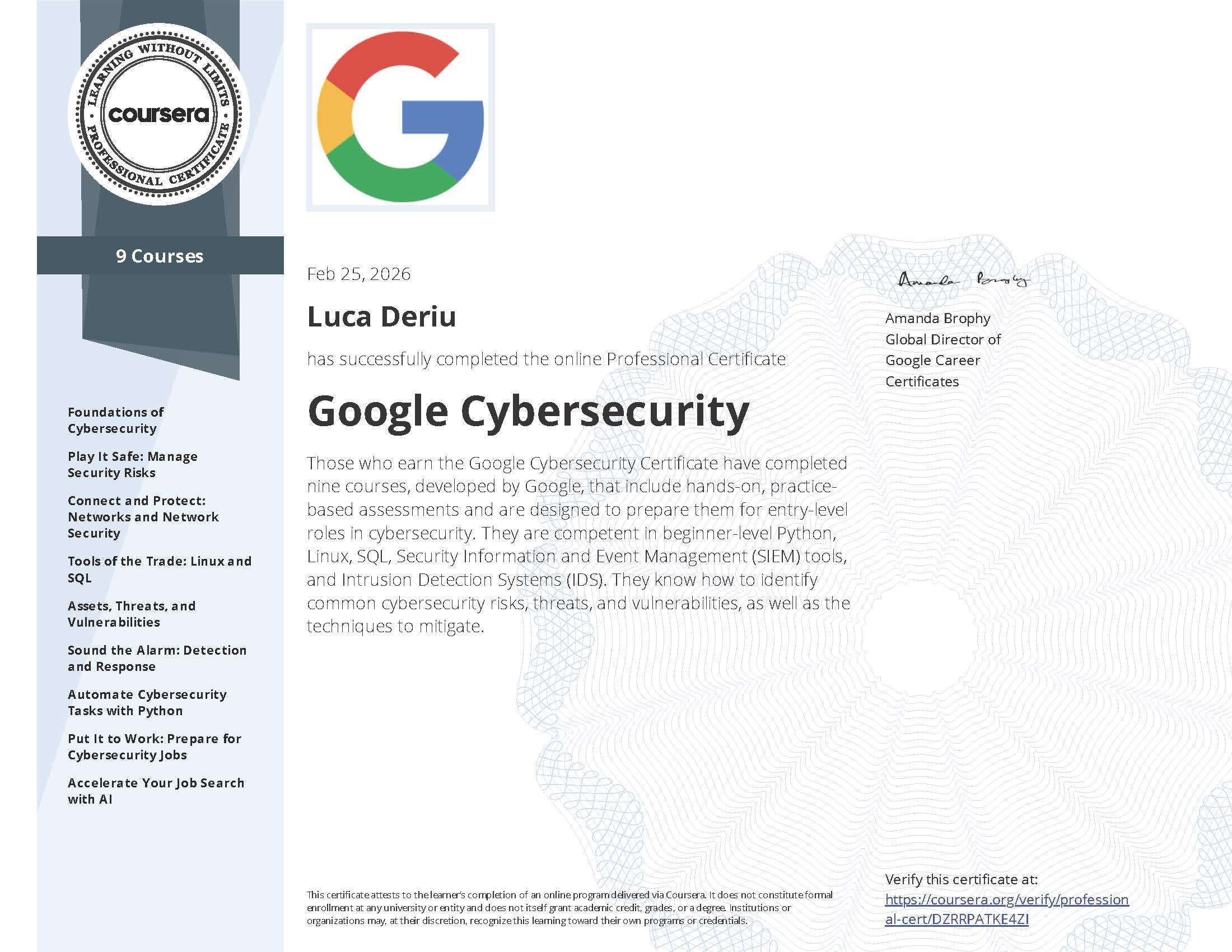 Google Cybersecurity (Coursera) – Competenze in SIEM, IDS, Python e SQL per la sicurezza.
